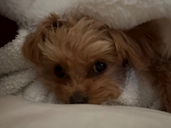 今日は一緒に寝てた🐶 今日も出勤です! 寒暖差アレルギーで肌荒れ治らんくて萎え こはく